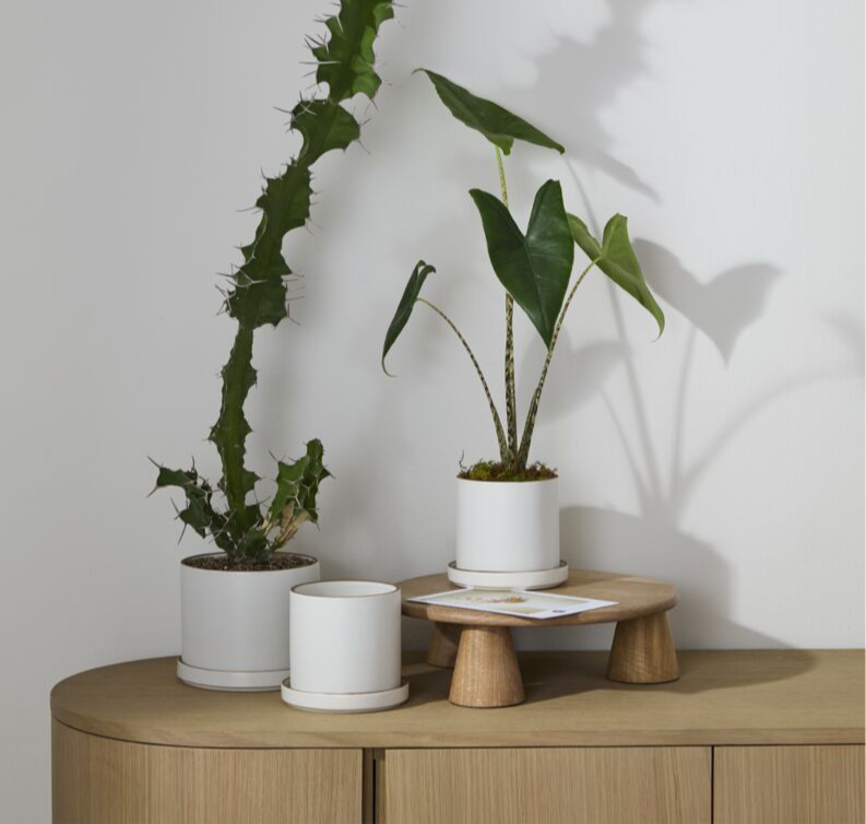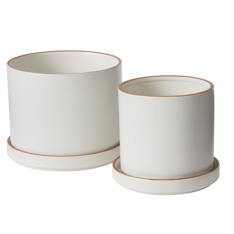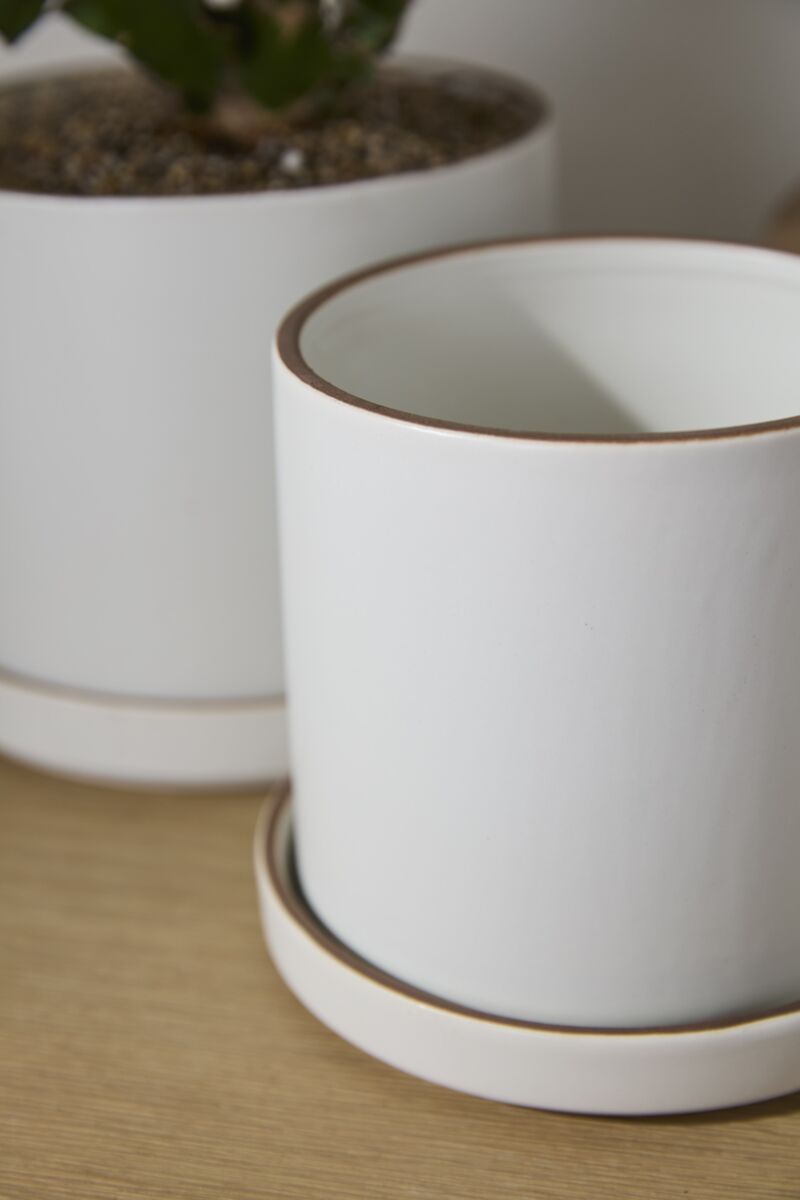 Simplicity and functionality combine in the Author Pot with Saucer, a super smooth, matte finish white pot with natural brown bisque showing through around the rim of the pot and saucer. The drainage hole and sealed saucer will make plants happy to call this pot home! Style alongside other neutrals as an elevated basic to ground any plant collection.