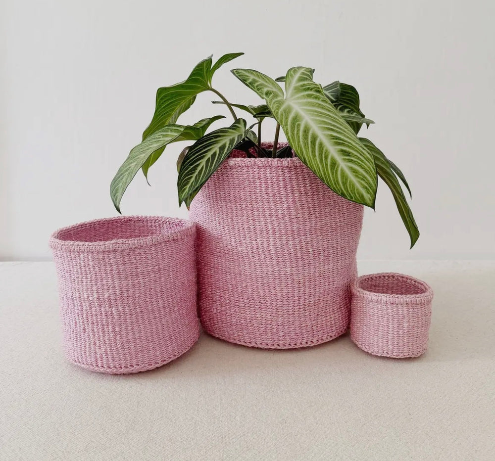 This sisal, woven basket is handmade by a weaving cooperative in southeastern kenya. The women hand-dye the sisal fibers and weave them into these beautiful works of art. Use this basket as a planter, for storage, or to liven up a shelf! Due to the handmade nature, colors and sizes may vary a bit.